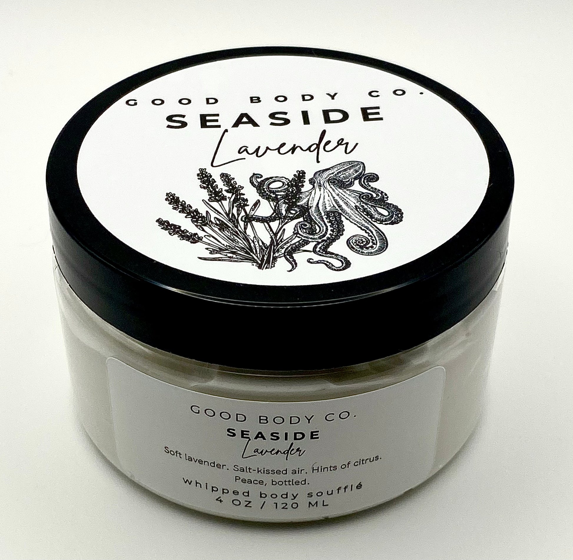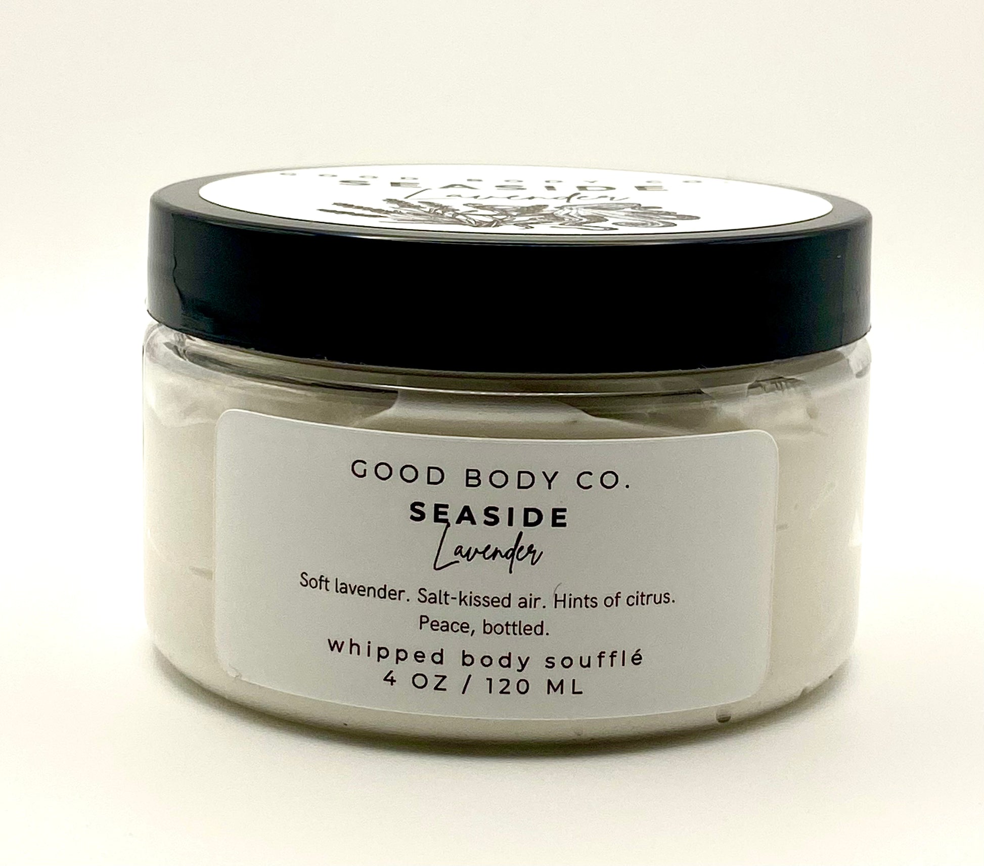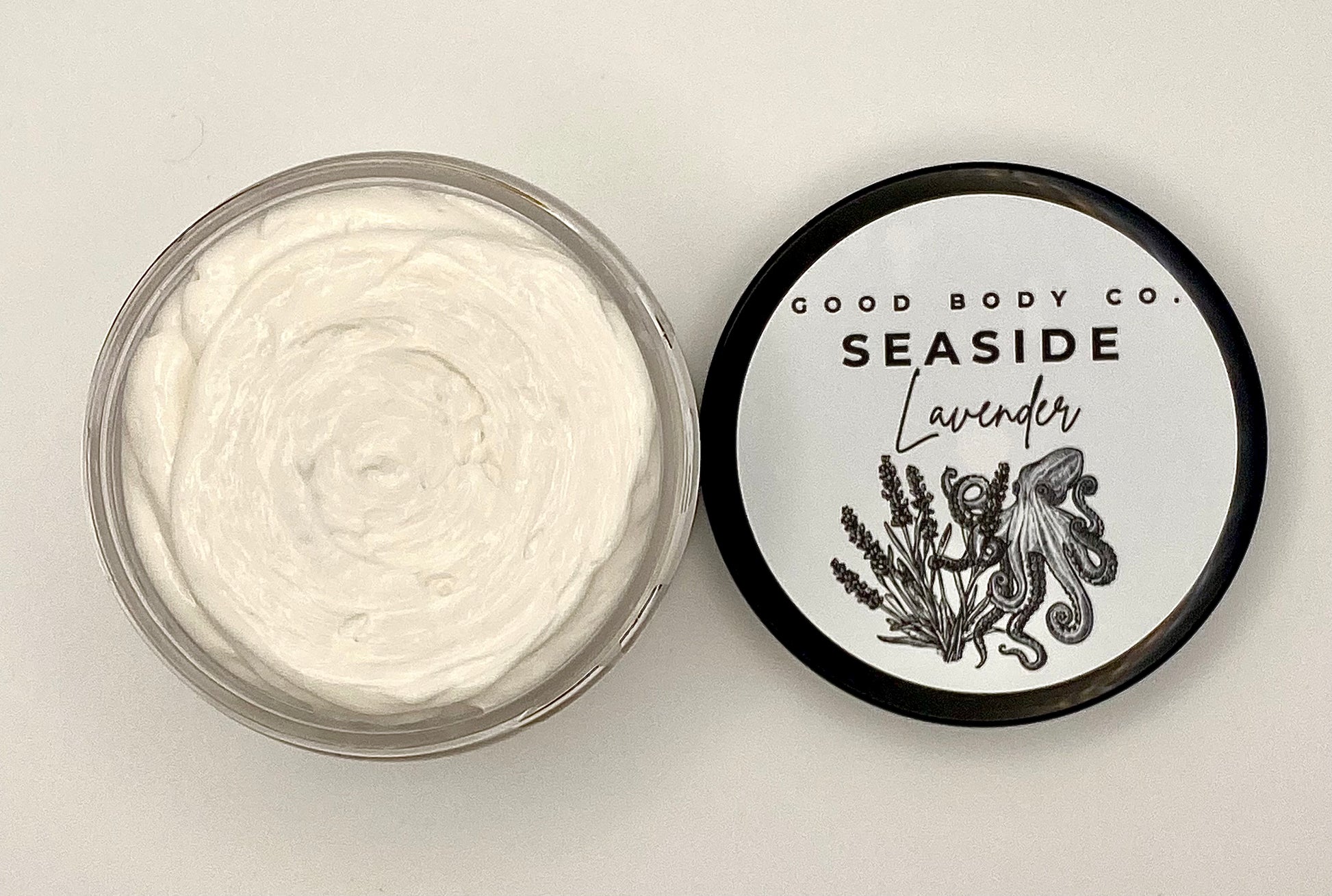 Relax and unwind with Seaside Lavender Whipped Body Butter from Good Body Co.. This organic, non-greasy body moisturizer soothes and hydrates the skin while leaving a calming lavender scent reminiscent of the sea breeze. Perfect for daily self-care, it helps your skin feel soft, smooth, and naturally radiant without any heavy residue.